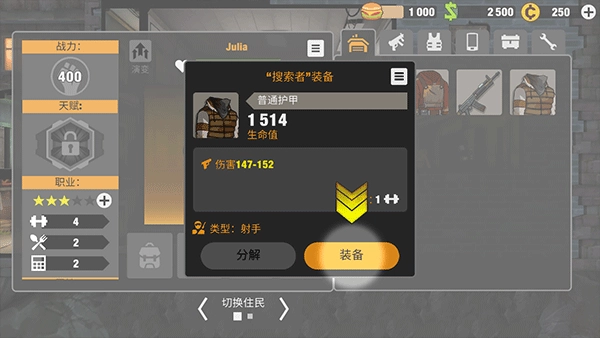 装备根据背景色来区别等级,从低到高分别是白色、绿色、蓝色、紫色和橙色,对应的级别分别叫普通、优秀、稀有、史诗和传说。不要的装备,可以分解成碎片,碎片可以用来制作更高一级的装备。居民穿戴装备没有限制,有就可以穿,1级就可以穿传说装,职业之间也可以混穿。