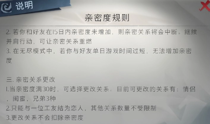 2、若你和好友在15日内亲密度未增加,则亲密关系将会中断。继续并肩行动,可让亲密关系重燃
