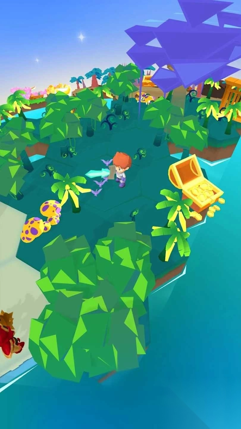 3、画面呈现卡通风格的丛林场景,有角色(手持武器)、宝箱、彩色蘑菇、植物、水域等元素,属于探索寻宝类的玩法场景。