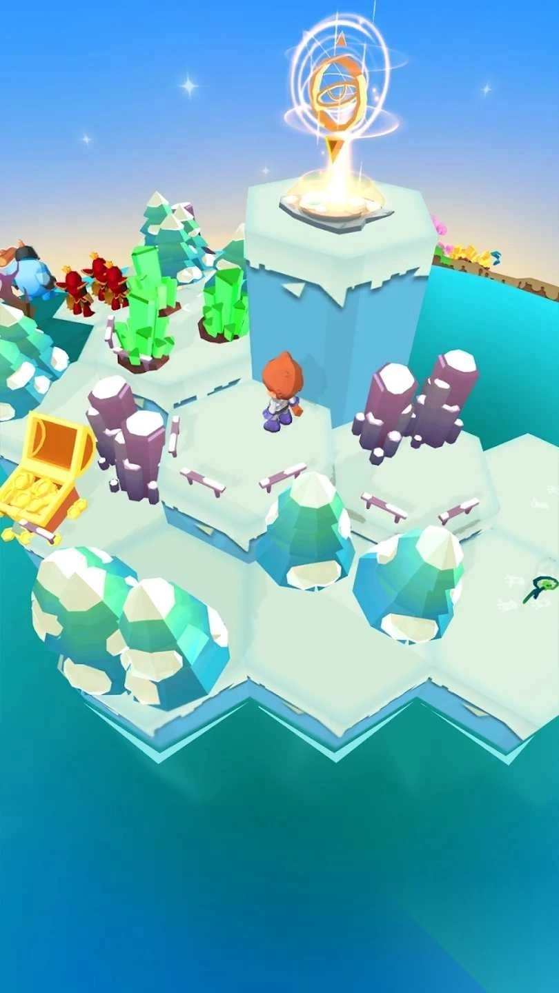 2、画面呈现卡通风格的冰雪场景,有角色、宝箱、彩色晶体、传送装置的发光物体等元素,红色箭头指向角色,属于探索闯关类的玩法场景。
