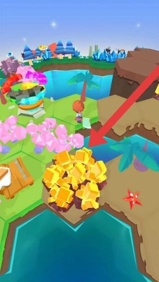 1. 画面展现出卡通风格的场景,其中包含角色、黄色矿石堆、粉色花朵、水域、树木以及建筑等诸多元素,此场景属于该游戏内探索采集类型的玩法场景。