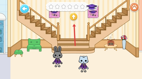 3、进入房间场景,点击箭头指引的门,探索新区域/触发剧情,操控角色(小动物)互动推进校园冒险。