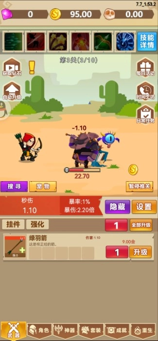 3、核心玩法为使用远程武器消灭来袭的怪物,每次成功击败目标都将积累相应数量的货币奖励。