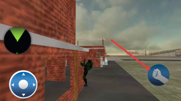 3、遇到可互动目标(如建筑内区域),点击右侧拳头图标,释放攻击/交互技能,推进游戏流程。