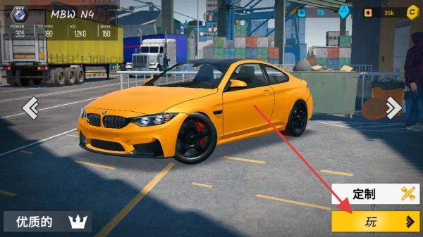2、在车库选黄色【MBW N4】车,看属性(Power),点【玩】,可【定制】升级,提升性能。