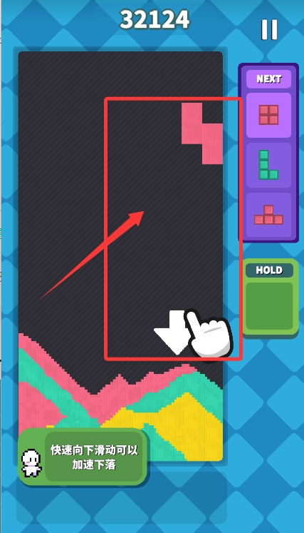 2、手指向下滑动能加快方块坠落速度,合理运用可快速填补空缺位置。