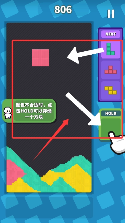 3、遇到暂时不需要的方块,可存入侧边储备区,待合适时机再取出使用。