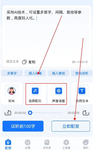 4、选择完毕后可以设置背景音乐和声音间距,然后点击立即配音即可