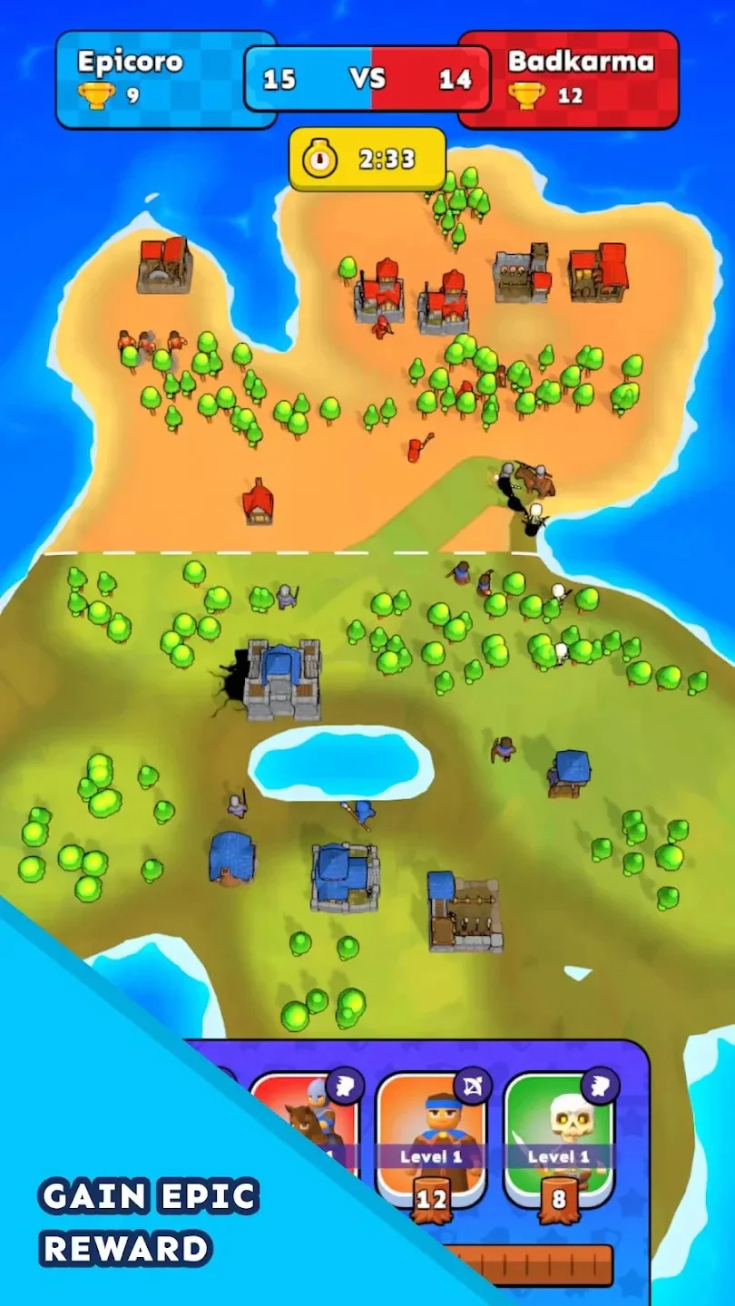 2.通过战斗获取箱子中的卡牌和资源,通过这张牌提升自己的军队,开启新的技能,强化自己的军队。