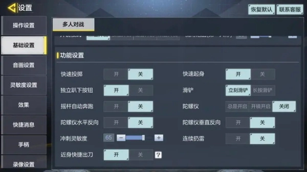 一键开镜立即开火打开,二指玩家只有一个开火键,打开这个功能,近身遭遇战的时候,按下开火键能马上打出子弹,不用等一键开火自动开镜,开了镜才能开枪的时间了,多一些胜算。近身迅捷出刀打开,把出刀键位跟开枪键位重叠,放在一起,因为用的是一键开火开镜模式,特别近距离一开火开镜实在是看不见人,敌方范围在出刀距离内,开火键就变成出刀键了,需要点反应。摇杆自动奔跑我给关了,觉得二指玩家锁定奔跑用不着,忙不过来,不如关了,直接摇杆加蹲下,感觉更容易滑铲,二指玩家的滑铲,基本是用于跑路规避伤害,或者听见拐角有人,提前滑铲出去,转动视角直接开枪,二指玩家不能同时滑铲开枪跟趴下开枪,趴下键位基本就没什么用了,也就躲障碍物后面趴下躲伤害才用的到。