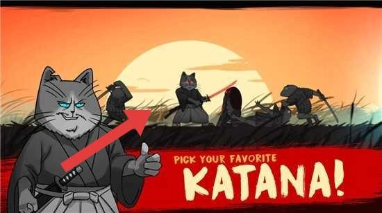 1. 在角色选择界面,点击箭头所指的武士猫角色,挑选心仪的“KATANA”(武士刀),随后开启游戏。