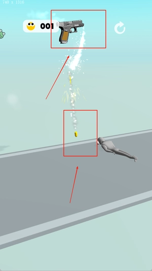 4、通过点击屏幕控制射击动作,手枪在开火时会产生反冲力使其跳起,利用这一机制完成高难度移动挑战。