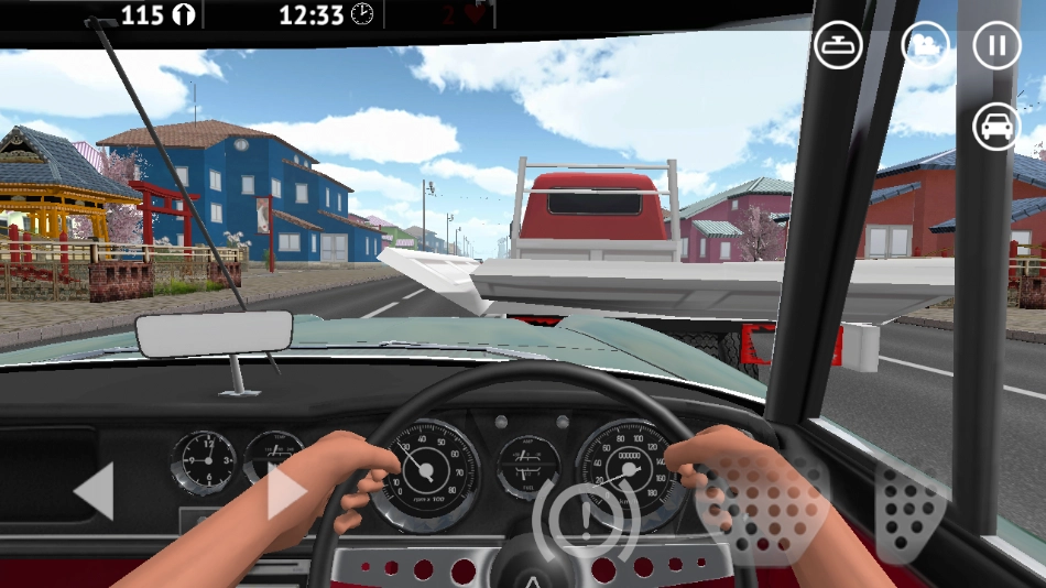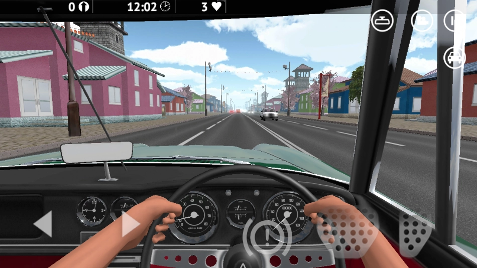 左上角第一个则是行驶的距离,中间则是时间计时,依次是生命值。若车辆发生碰撞则会损失一格生命值,右上方的图标信息依次是后视角,相机(视角切换),暂停和菜单按钮以及车辆内部的灯光、喇叭和转向灯。