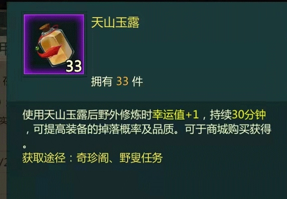 使用后野外修炼幸运值+1,持续30分钟。天山玉露可以直接从奇珍阁购买,在野叟任务中也可以获得,所以大家看到天山玉露一定要毫不犹豫选择他。同时在野外开启十倍修炼也可以获得1点幸运值。幸运值最高上限为4。