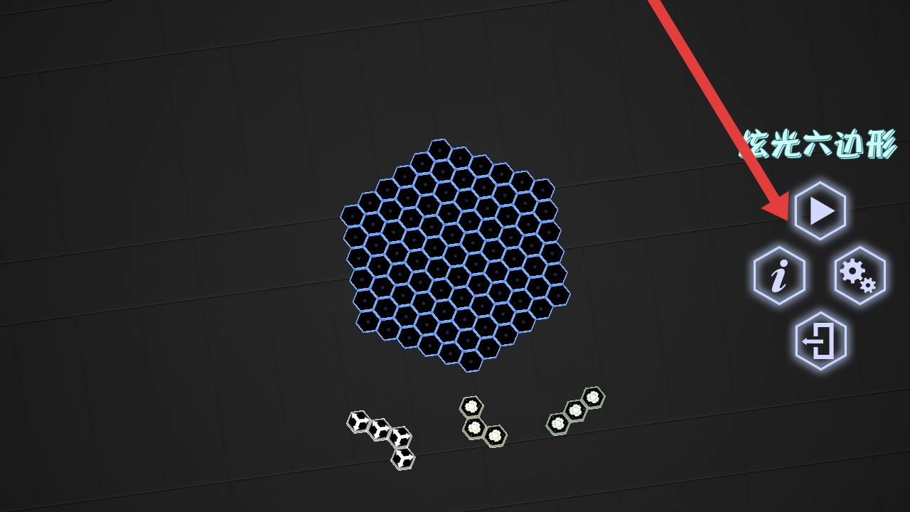 1要开启炫光六边形游戏,需点击炫光六边形主界面上,右侧箭头所指的六边形播放按钮。
