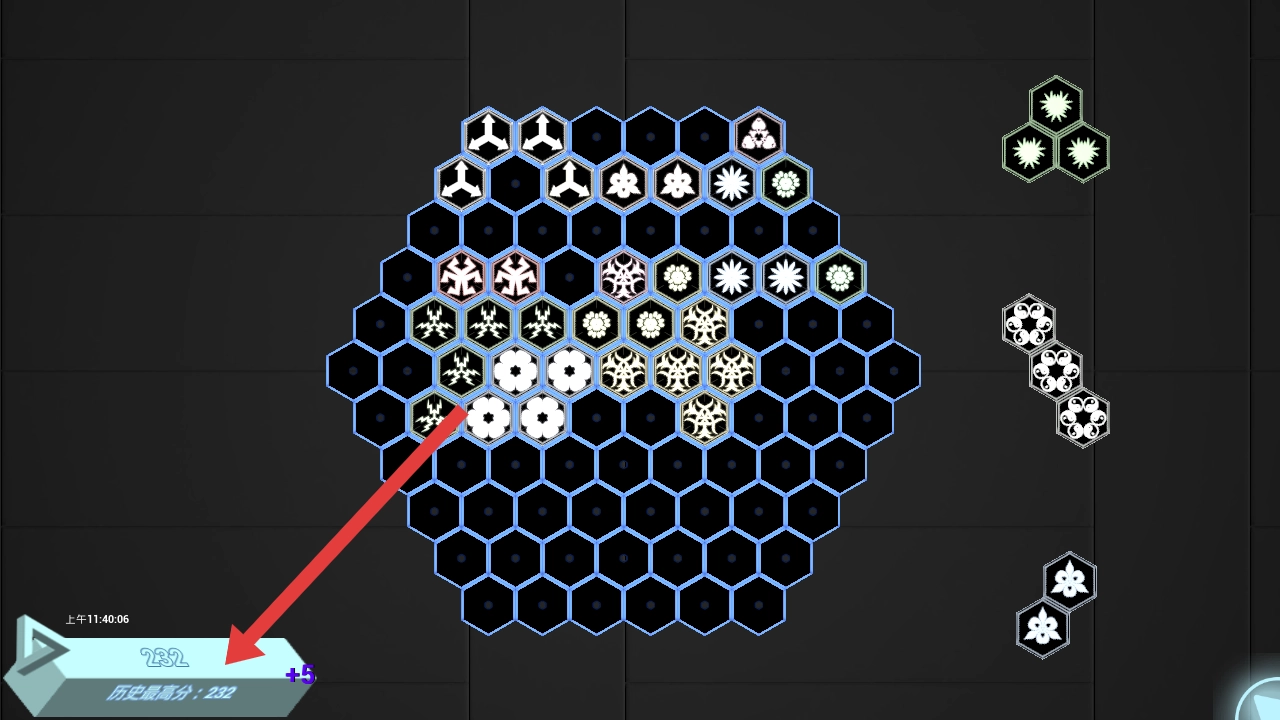 3、需要持续放置图案,积累左下角显示的分数(如“232”),挑战突破历史最高分纪录。