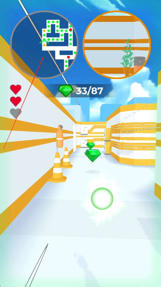 1. 进入游戏,来到迷宫入口,点击屏幕即可开启奔跑。通过滑动指尖来操控角色向左或向右转,避开第一关的红色警戒区域,同时收集初始位置的蓝色钥匙道具。