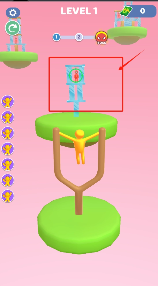 1、点击红框内的蓝色结构,发射小人,瞄准红色敌人,注意躲避BOSS的攻击,别被打中。