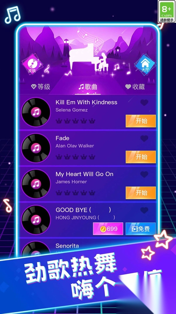 1. 难度分为从萌新到大师共6档,系统会依据表现自动推荐曲目,助力你逐步提升技巧。