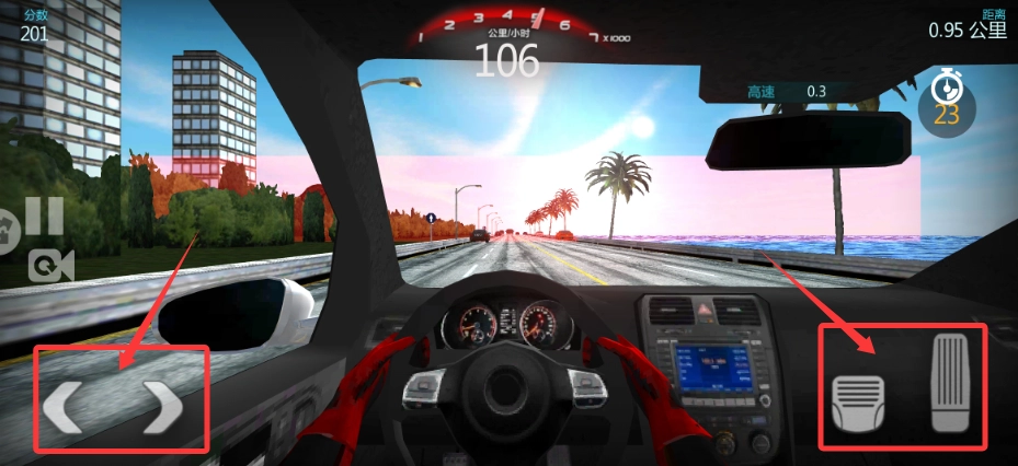 3、进入赛道上,用左侧方向键控制方向,右侧按键控刹车、油门,可驾驶赛车一路狂飙。