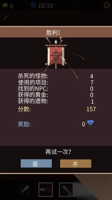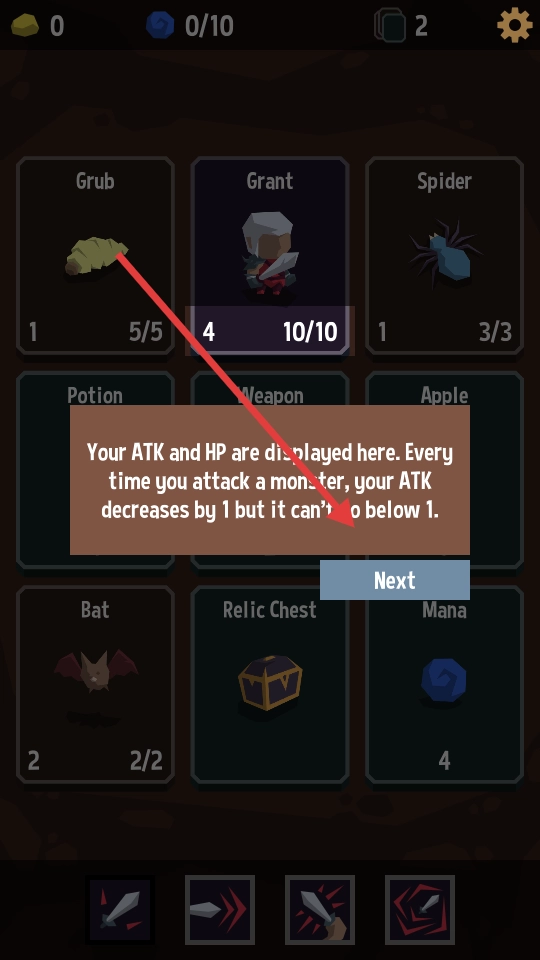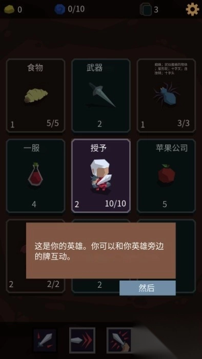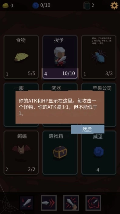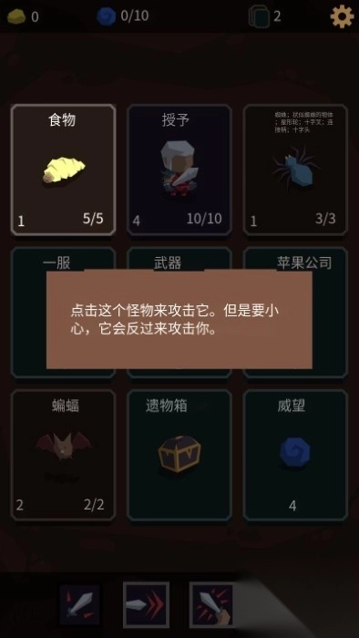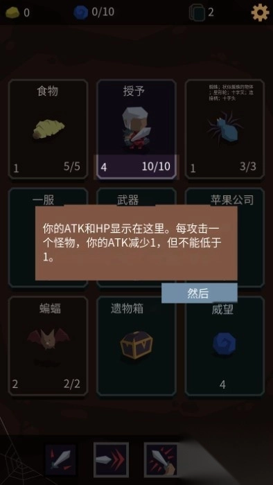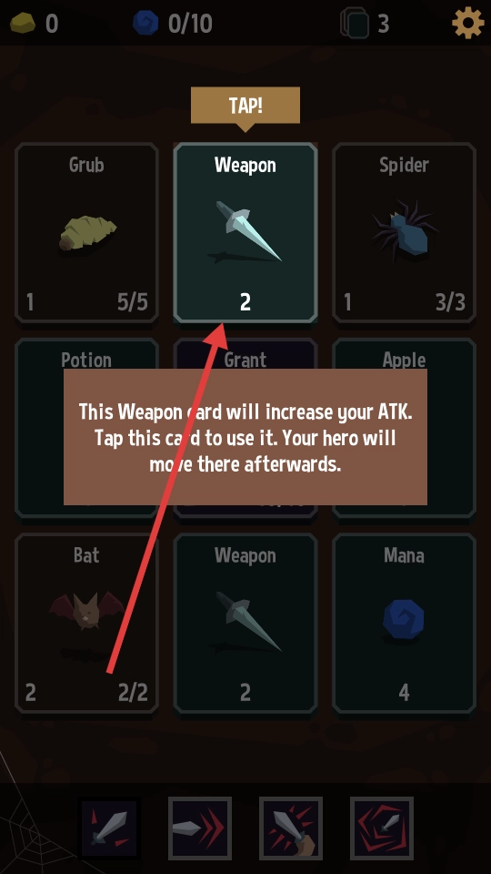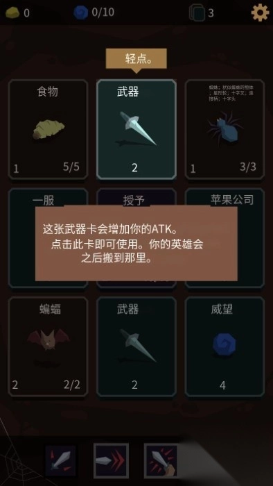 1、轻触武器卡牌能提升攻击力,点击血瓶可以恢复血条,不过千万别随意点击怪物卡,除非你想被怪物反杀。