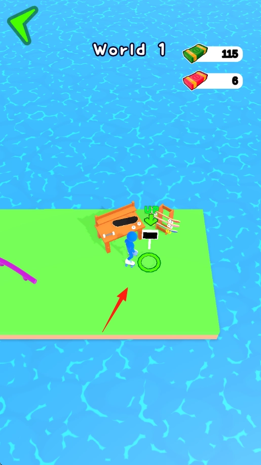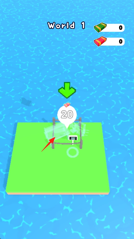 1. 游戏开局设定:以“World1”为起始,蓝色角色处于绿岛之上,箭头指向标有“20”数值的区域,玩家在此过程中需要收集红色与绿色的道具(红包、钞票) 。