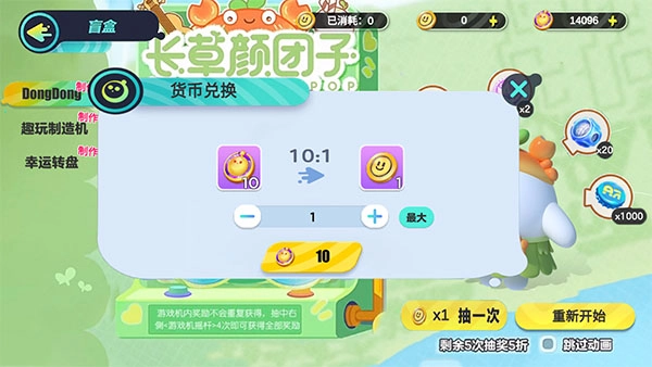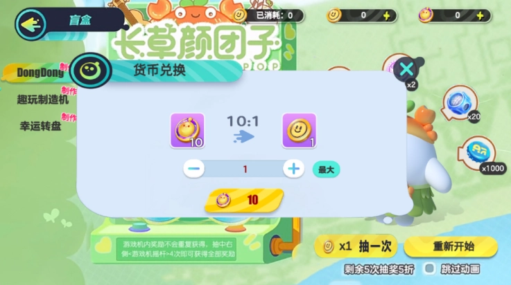 3、开始抽奖啦,抽中右侧摇杆机就有四分之一的概率获得长草颜团子装扮