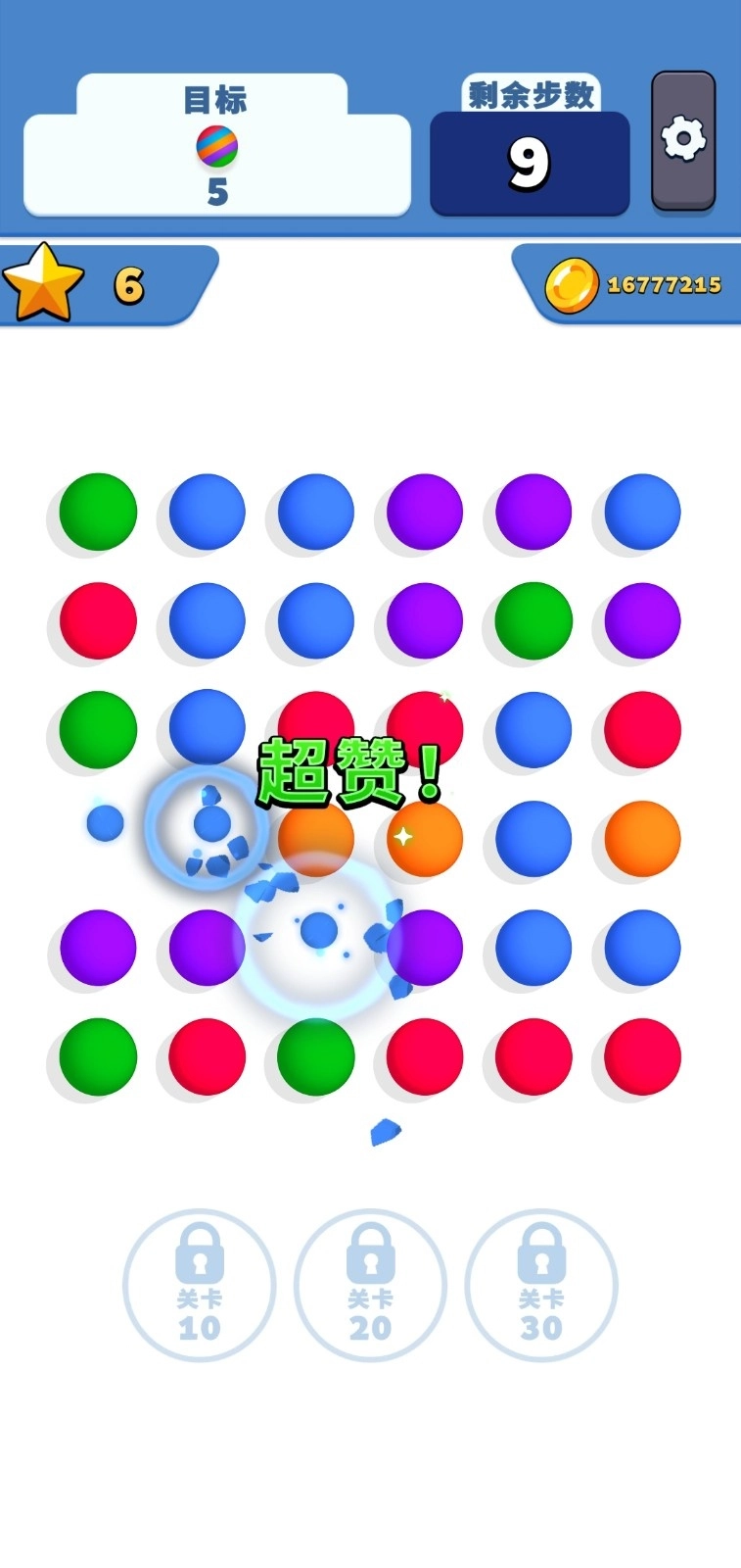 2.在限制步数的关卡中,尽量每步消除多个球球。