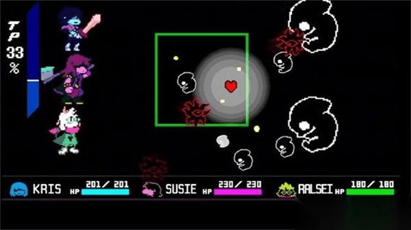 5、当第一次击败boss后boss会进入恢复阶段,这个阶段可以随便打,boss不会掉血,等boss恢复完毕后会进入剧情,剧情结束后会绿龟先生会加入战斗,此时需要将Kris扔进泰坦中心位置就可以进入剧情结束战斗。
