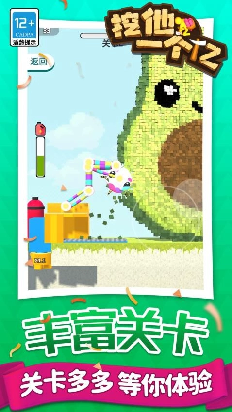 1、开局一台挖掘机,可以随意粉碎各式墙体,过程解压;每一个关卡设置了不同通关目标,海量关卡等你来挑战;