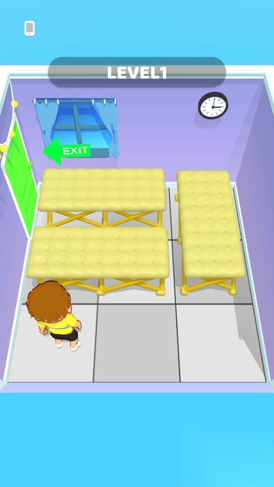 3、在场景中收集钥匙道具解锁房门,部分关卡设置限时挑战,需在时间耗尽前完成折叠床的路径规划与障碍突破。