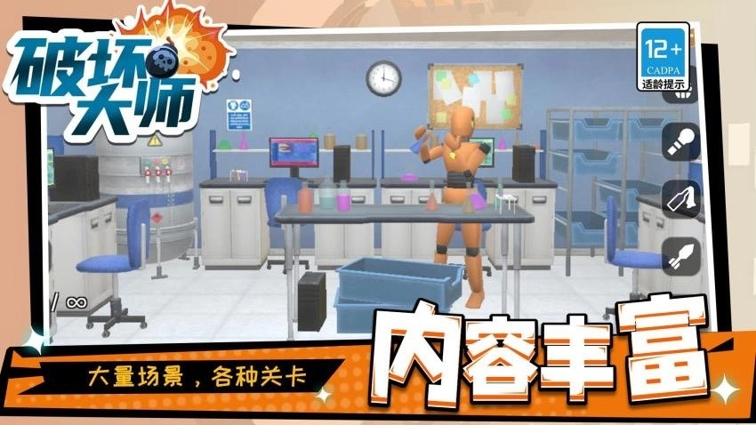 1、休闲创意类小游戏,其中包含各种房间和武器来模拟破坏,就是肆意的恶意破坏!