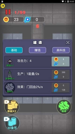 5、维修台的作用是自动帮你修复被敌人破坏的门,建议至少设置三到四台,才会有比较明显的修复效果,别等门破了才发现修不回来。