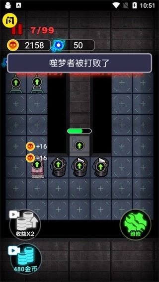 2、在防御模式中,玩家可建造炮台、强化防御,抵御噬梦者的如今。