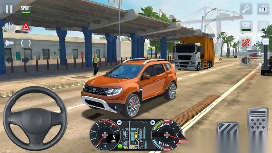 2、按场景提示(如收费站),操控车辆(如橙色SUV)平稳通过。