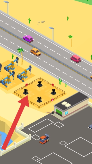 2、呈现的是油田区域,包含油泵、道路、车辆等元素,属于开采、经营石油产业,规划油田设施布局与运输路线的玩法场景。