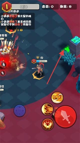2、战斗中,往箭头方向(如绿色发光点)移动,遇怪用技能(火焰、爆发)清场,注意上方“击杀0”“剩余8”,推进关卡。