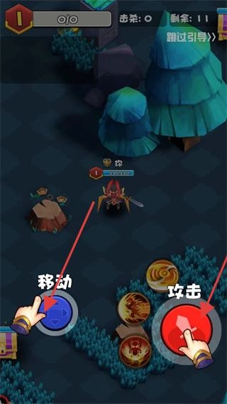 1. 操控角色走位需使用左侧的【移动】摇杆,右侧的【攻击】键可实现自动射击。游戏开始后,跟随引导进行操作,熟悉玩法,清理地图上的怪物,达成“剩余11”的目标。