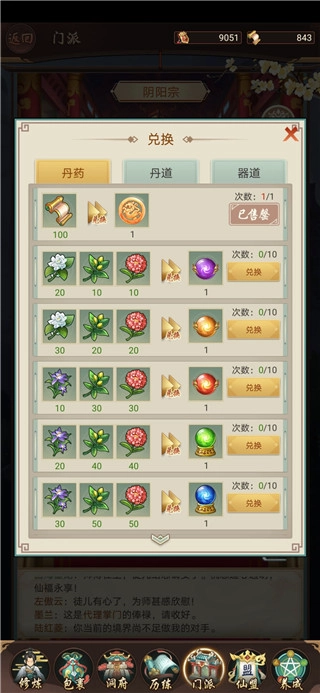 其次游戏中的丹道+器道全壶图纸,炼金术和炼器是两种非常重要的玩法,很多朋友都知道如何提升炼金术和炼器的经验,却发现在坊市里找不到高级丹炉和器鼎。神符其实前两阶的丹炉和器鼎都可以在坊市买到,第三阶的物品是可以兑换的,但从第四级开始就必须通过学校首徒来兑换不同等级的丹炉或装备图纸。学校的神符每天只能兑换一个100贡献,所以大家记得每天兑换,这样以后就不会有炼金术和炼器的工具了。