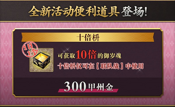 在确定出阵之前,要是审神者选用便利道具【三倍枡】,那么本轮出阵完毕后会获取三倍的【御岁魂】;要是审神者选用本次联队战新推出的便利道具【十倍枡】,那么本轮出阵结束后将会获得十倍的【御岁魂】。
