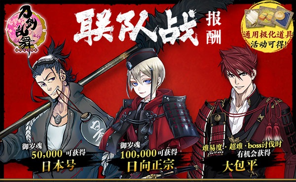 在活动期间参与联队战,收集【御岁魂】,就能获取相应奖励,其中包含极化道具以及新的刀剑男士。当收集的【御岁魂】数量达到50000,可得到【枪·日本号】;若收集【御岁魂】数量达到100000,可获得新刀剑男士【短刀·日向正宗】;要是累计收集【御岁魂】数量达到150000,则总共能获得三套通用极化道具。此外,击破【难易度·超难】的BOSS点,还有机会拿到【太刀·大包平】。