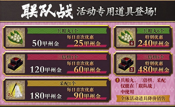 5、道具【兵粮丸】、【三倍枡】、【十倍枡】、【采配】均为联队战活动限定道具,仅能在活动【联队战】中使用。活动期间,全体活动道具在万屋均有特价销售。