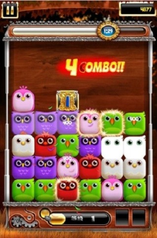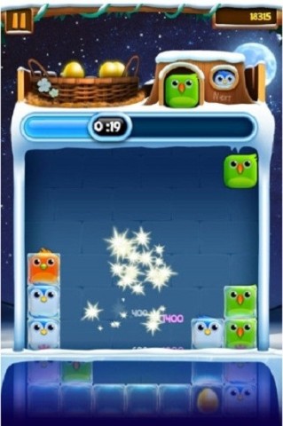2. 聚集4只同色小鸟时,奖励一只发光鸟,消除后会影响周边小鸟或冰块。