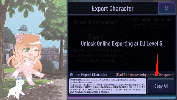2、在弹出的选项中点击 “copy all”,将生成的人设代码完整复制下来。