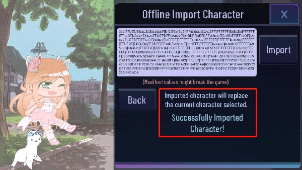 4、在输入框内粘贴之前复制的人设代码,点击 “import”,下方显示 “successfully imported Character” 即保存成功。