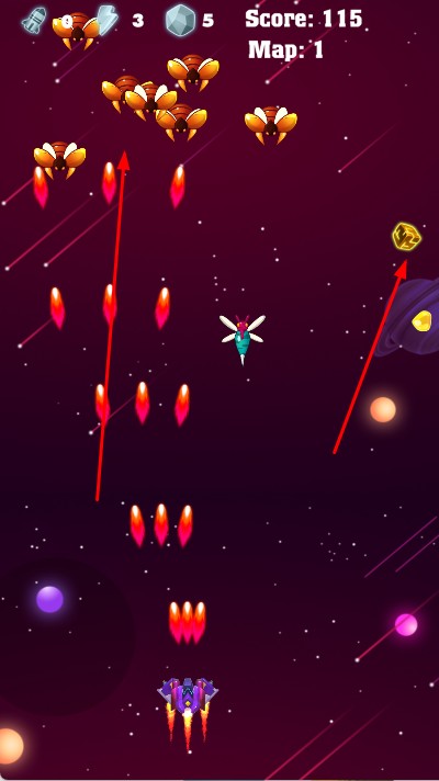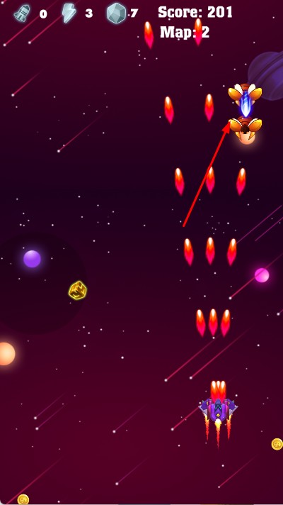 2、在场景中,通过移动操作,控制战机躲避敌方子弹,同时点击射击按钮发射武器攻击敌机,收集场景中的金币、道具。