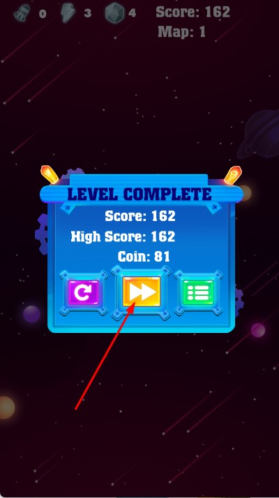 3、成功击败一波波敌机,存活到关卡结束,显示关卡完成,点击箭头按钮进入下一关。
