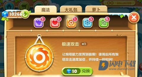 3、极限火力:消耗10颗宝石解锁一次极限火力效果,能让所有炮塔的攻击频率达到峰值,该状态持续10秒,可助力快速扭转战场态势。