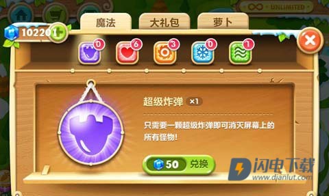 5、超级炸弹:仅需花费50颗宝石,就能清除屏幕上除铁皮怪以外的全部怪物,无疑是陷入绝境、最后一搏时的强力帮手。