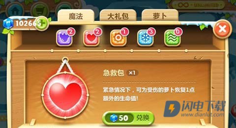 4、急救包:在关键时刻为受伤萝卜恢复1点生命值,价值50宝石,切记使用最佳时机。